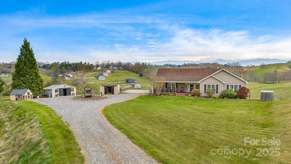 Welcome to the homestead/mini-farm life! This nicely updated 4 bedroom home on 3.25 acres has lots of room and incredible long range mountain views! Perched atop the hill overlooking the fenced pasture, the view is great off the back deck, which is accessed from the dining area/kitchen. The open floor plan concept flows nicely, and main level living is a big plus! Gas log fireplace in the living area for keeping cozy on the cooler nights. The Primary bedroom is spacious with a nice en-suite full bath, and three additional bedrooms plus a full bath on main level. Laundry room is spacious and has a deep sink as well. The walkout basement features a huge family room/den with a real wood stove for additional heat and ambiance. Walk out to the hot tub, which conveys with the home. The unfinished portion has a great indoor shop and unfinished but functional 1/2 bath. See the property video here: https://listings.wncrealestatephotography.com/videos/019639ff-68c8-7094-bd0c-84cb894a2387