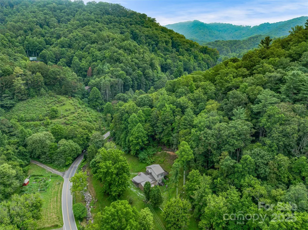 Re-imagined tranquil creekside homestead in the heart of the East Fork Community. Ideal for artists, gardeners, and anyone seeking a deeper connection to land and neighbors. This fully fenced property features fruit trees, berry bushes, grapevines, garden beds, chicken coop with enclosed run, outdoor cat sanctuary, and borders the peaceful East Fork Bull Creek. Inside, custom woodwork includes butternut hickory walls, maple floors, and a cherry mantel. Vaulted ceilings, an open-concept layout, and artistic touches add warmth and character. The kitchen offers abundant storage, island with second sink, and stainless appliances. Upstairs, the private primary suite boasts two decks and a tiled ensuite bath with double vanities. Detached 540 sqft garage/workshop/studio. Just 4 miles to downtown Mars Hill and the university, this retreat blends rustic charm with modern comfort, offering space to live off the land in a close-knit mountain community.