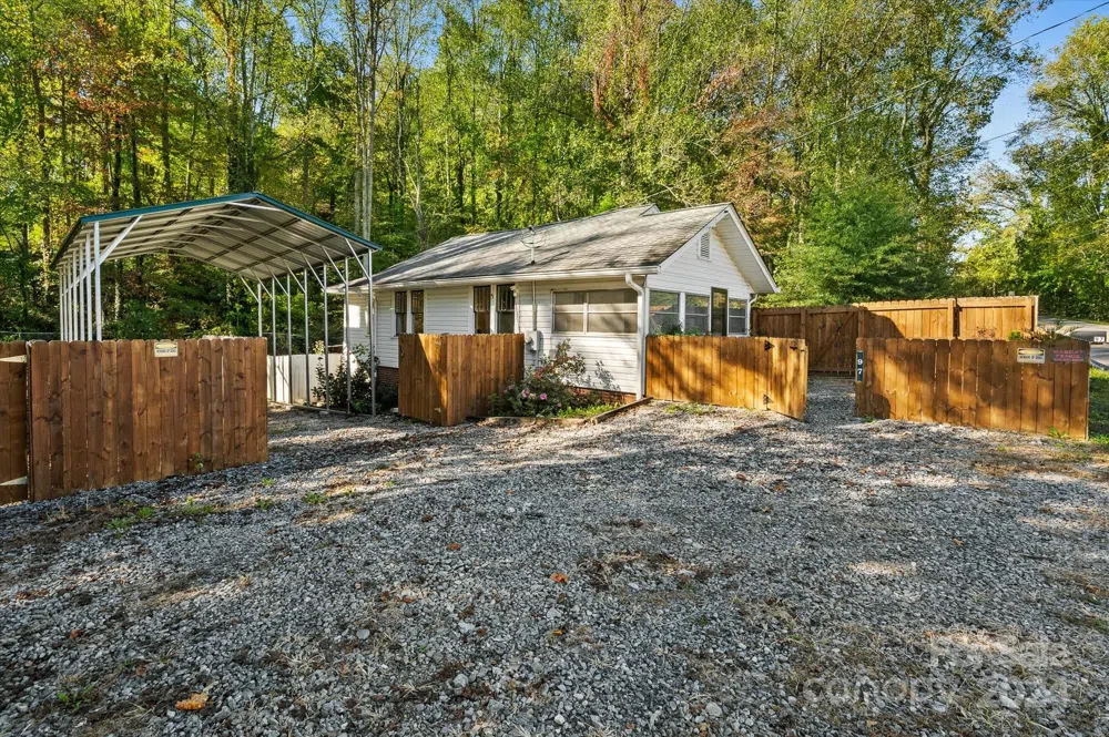 Nestled behind a tall privacy fence, this charming home offers a peaceful retreat situated along a serene stream that runs the full length of the property in a deep, natural bed—remaining safely within its banks even during Hurricane Helene. The fully fenced-in yard provides privacy and security, while offering the opportunity to contain pets or farm animals among a mature poplar grove. The spacious back deck off the kitchen is the perfect spot to grill out or relax and take in the beauty of the surroundings. This outdoor space offers a wonderful extension of the home. Secure parking with ample space and a tall carport is ideal for housing a boat or recreational vehicle. A large, unfinished dry basement offers plenty of space for storage or projects. Out back, a private hot tub deck is already wired with 220V electrical. This property offers a picturesque setting, ideal for those seeking a blend of indoor and outdoor living.